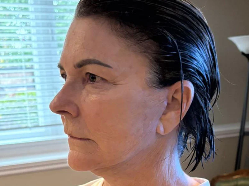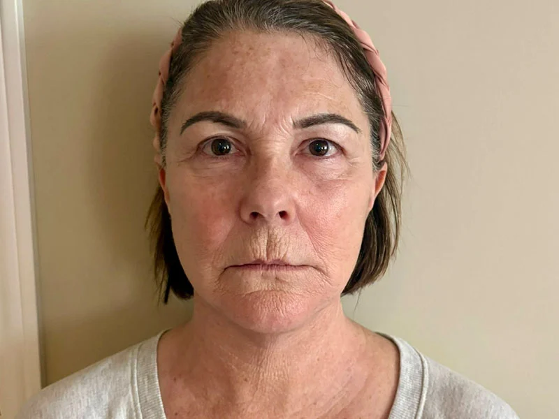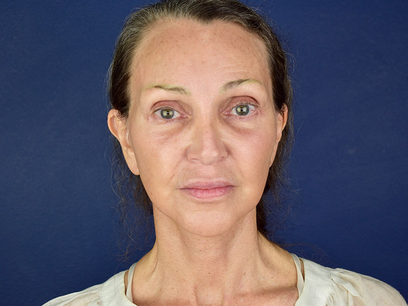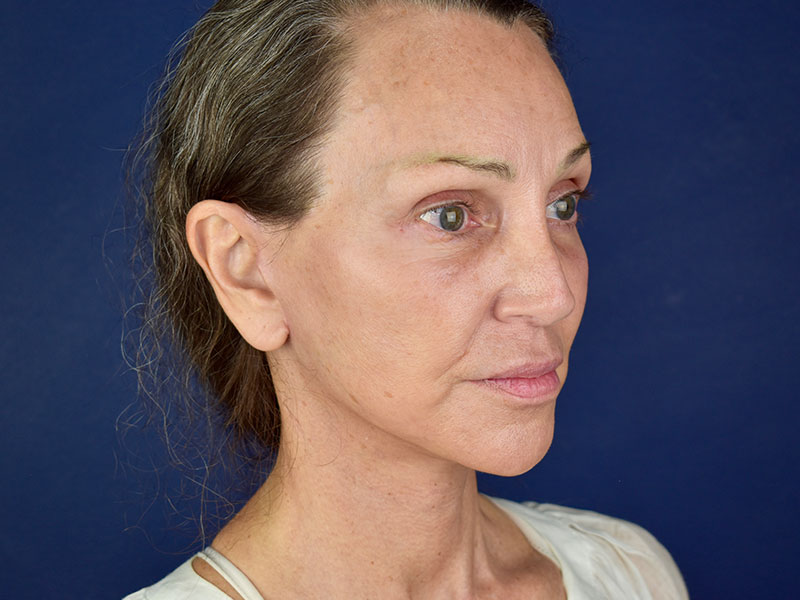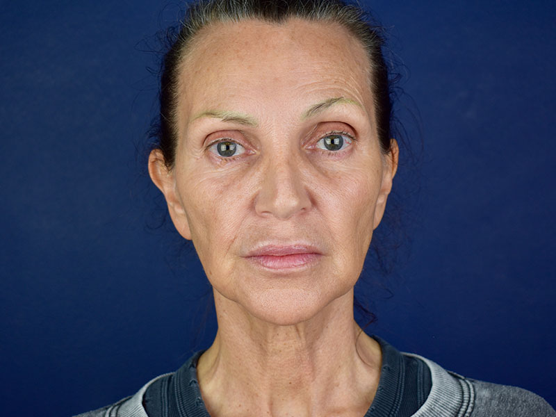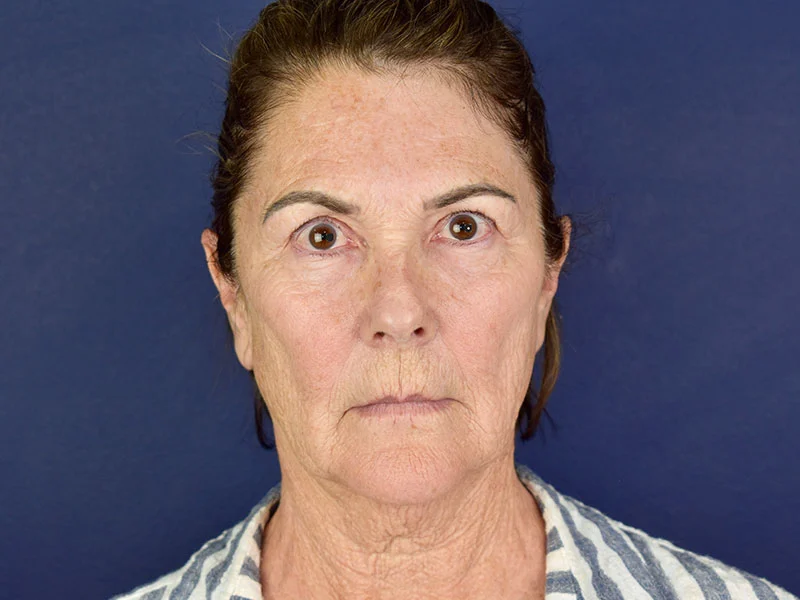 This comprehensive rejuvenation was delivered in two strategic stages. Stage One addressed the upper face with an Endobrowlift, temporal forehead lift, and precision upper eyelid canthopexy. Five days later, Stage Two completed the aesthetic with a Deep Plane Face and Neck Lift, fat grafting, and a deep lip lift (cupid lift) to restore facial harmony and contour.