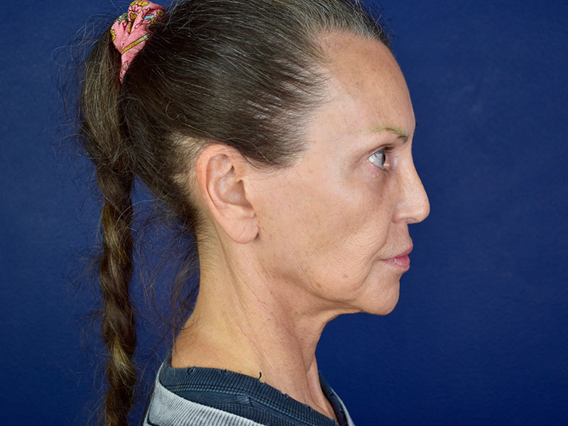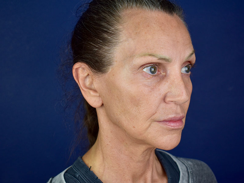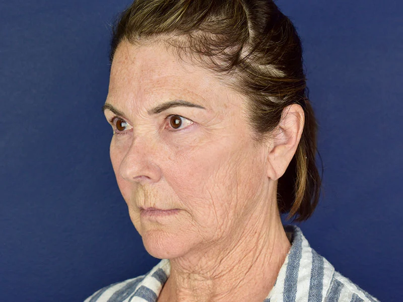 This comprehensive rejuvenation—following a prior lift performed years ago by another surgeon—was executed in two strategic stages. Stage One refined the upper face with an endoscopic forehead and browlift, transconjunctival lower eyelid refinement, and canthopexy. The full aesthetic was completed in Stage Two with an advanced Deep Plane Face and Neck Lift and facial fat grafting to restore youthful contour and volume.